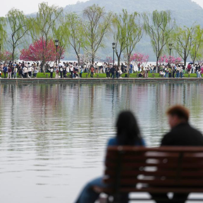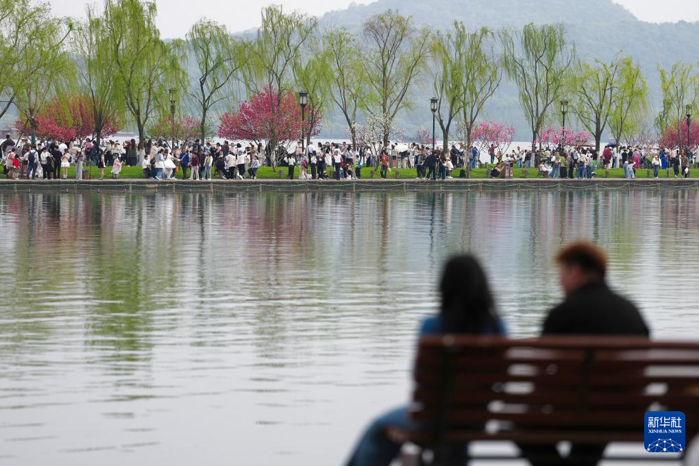 4月2日,游客在杭州西湖景区的白堤上游览。