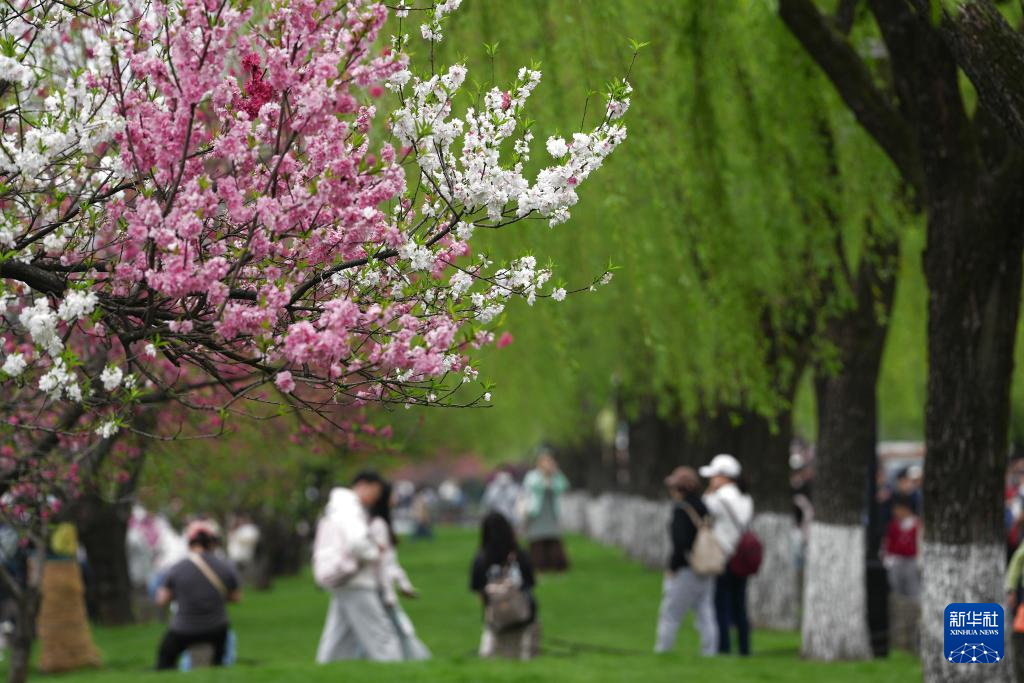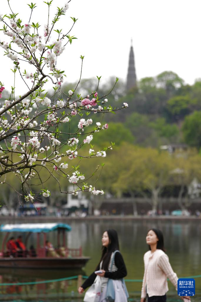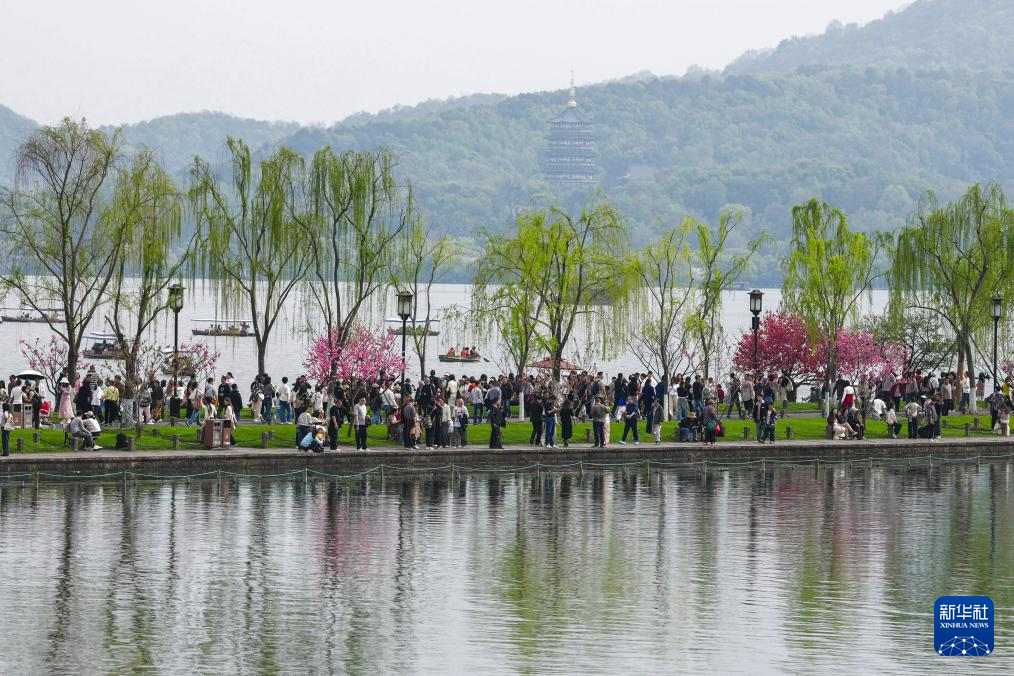 近日,浙江杭州西湖景区呈现出桃红柳绿的春日丽景,吸引市民和游客前来观赏。