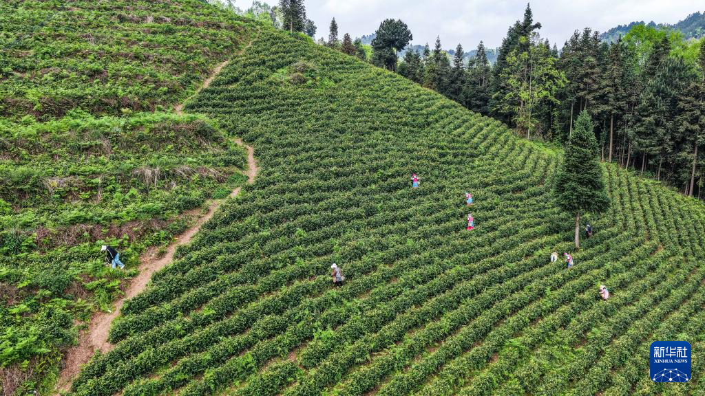 4月2日,茶农在六盘水市六枝特区月亮河彝族布依族苗族乡的茶山采摘春茶(无人机照片)。