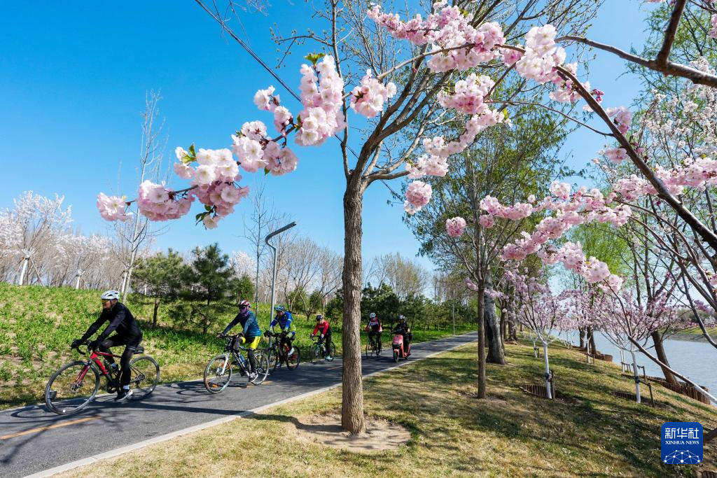骑行爱好者在北京市坝河岸边骑车(4月1日摄)。