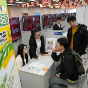 4月2日,求职者与参会企业工作人员在杭州市高校毕业生就业专场招聘会上洽谈。