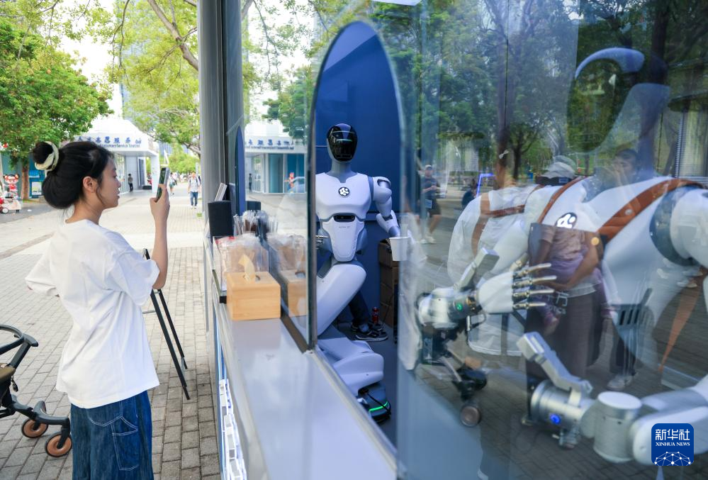 4月1日,游客在深圳人才公园体验机器人制作饮品。