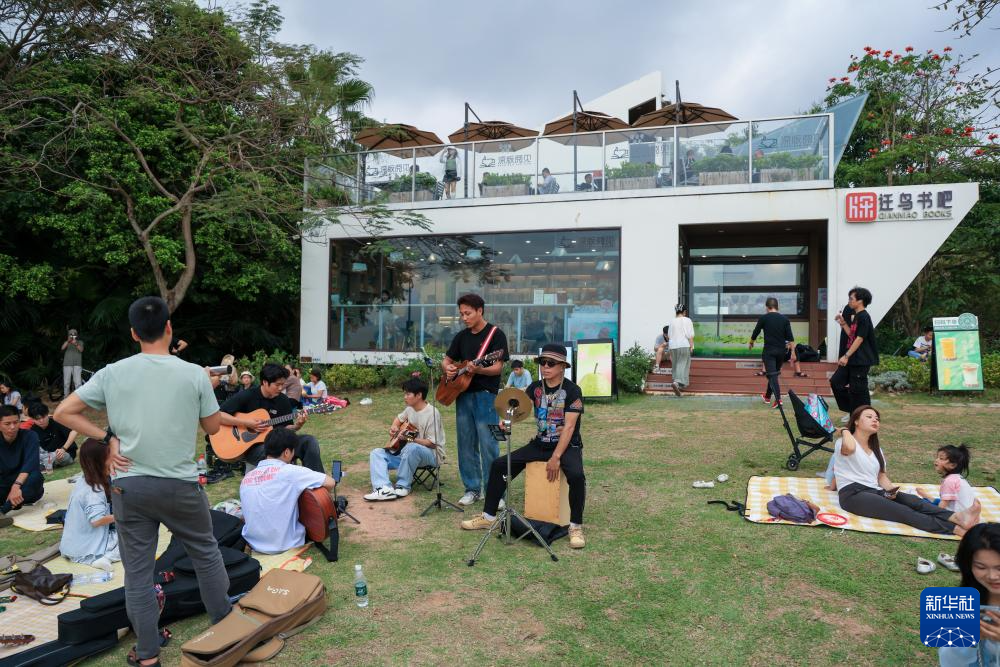 3月29日,游客在深圳湾公园设立的迁鸟书吧外休闲。