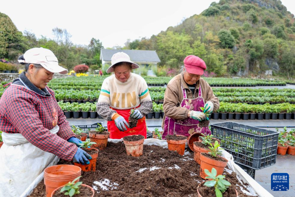 3月28日,百里杜鹃管理区汇境花卉科技园的工作人员将杜鹃花苗装盆。