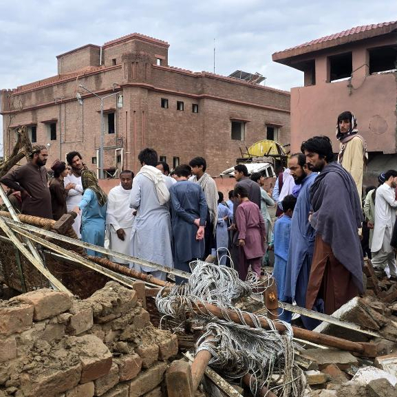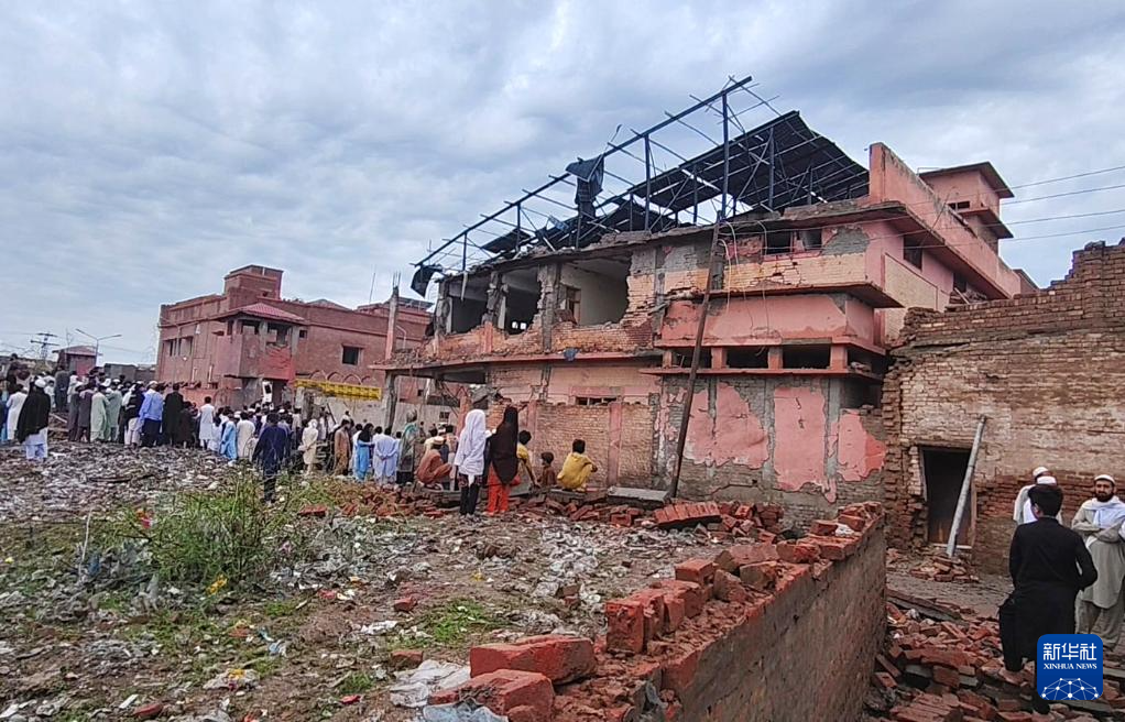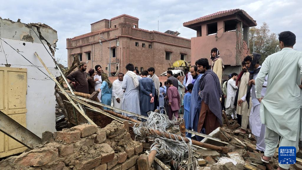 4月3日,在巴基斯坦西北部开伯尔-普什图省本努地区,人们聚集在一座损毁的建筑旁(手机照片)。