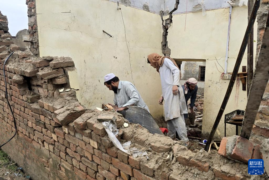 4月3日,在巴基斯坦西北部开伯尔-普什图省本努地区,人们检查在袭击中受损的房屋(手机照片)。
