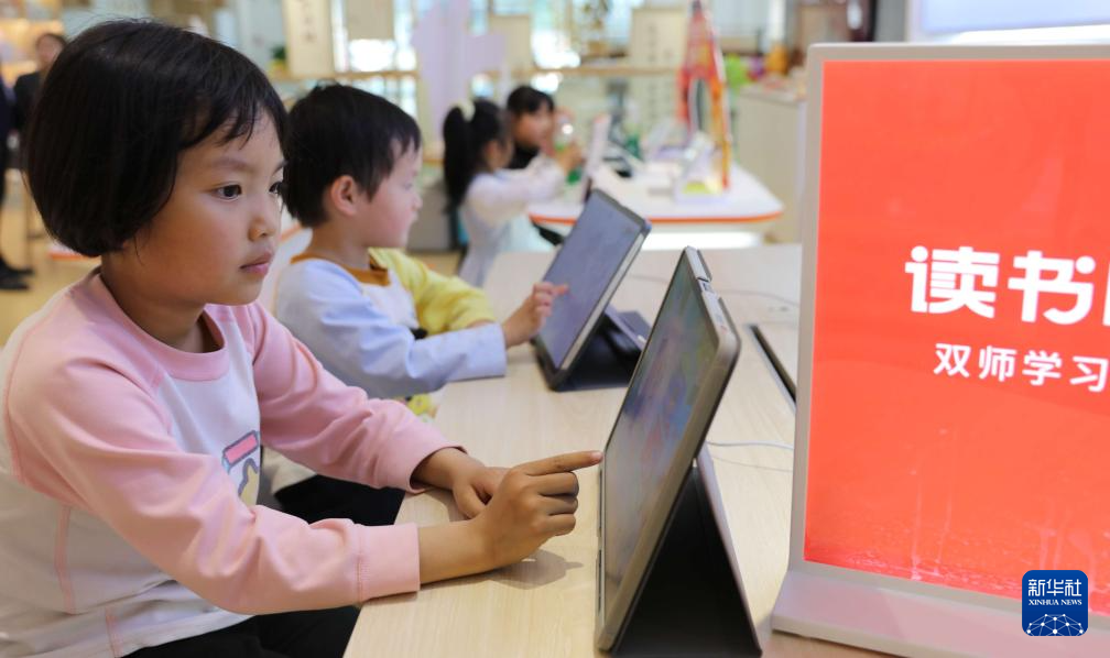 4月3日,四川省宜宾市长宁县的小朋友在新华文轩阅读电子书。