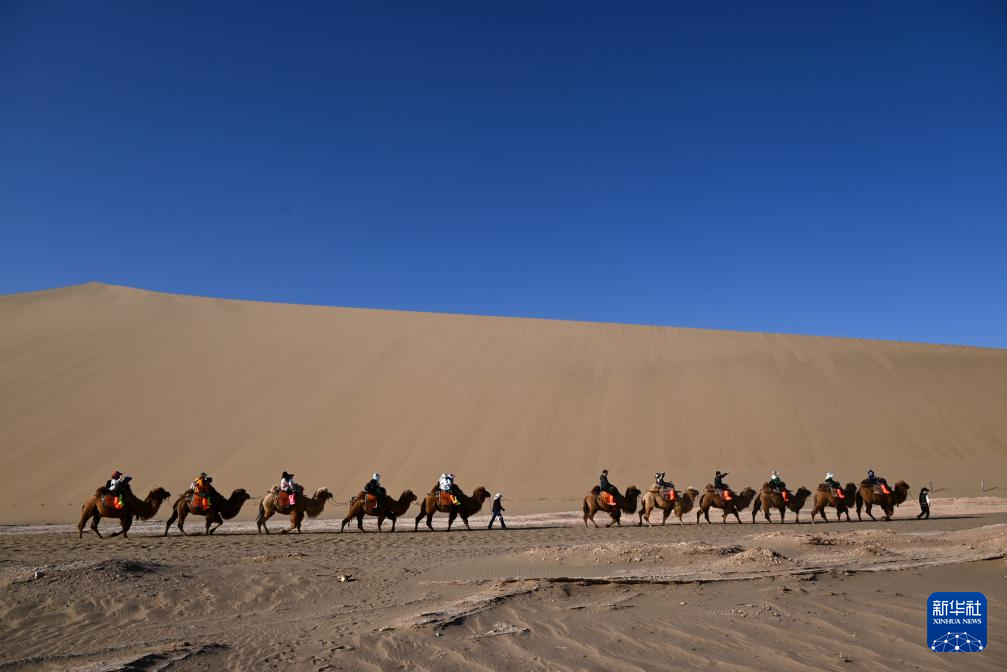 4月4日,游客在甘肃省敦煌市鸣沙山月牙泉景区游览。