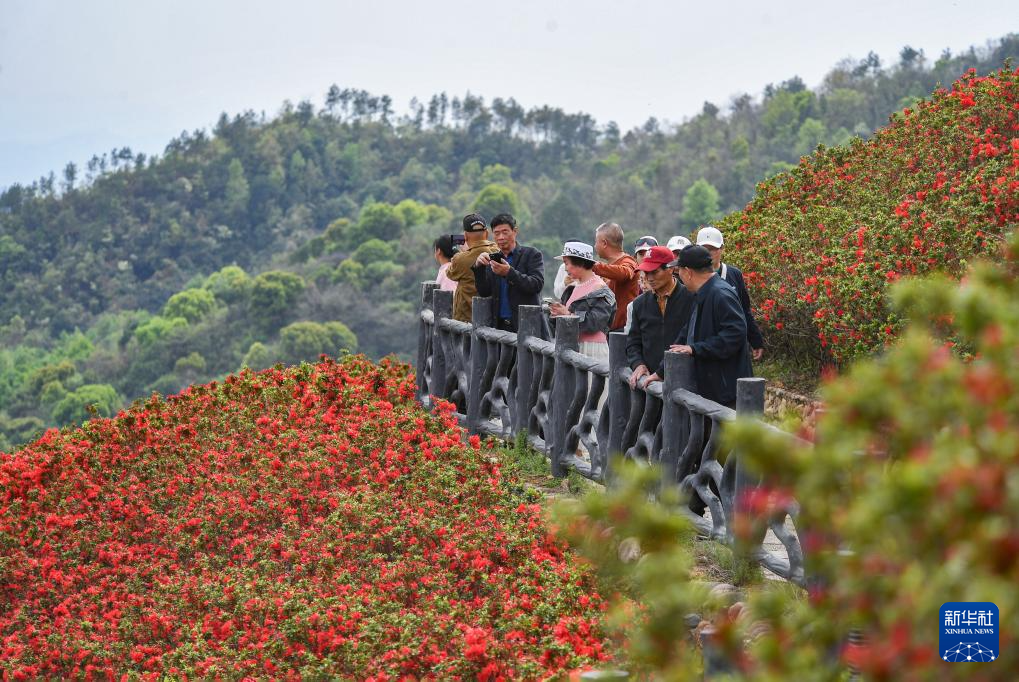4月4日,游人在浙江省金华市金东区曹宅镇横腊村观赏盛开的杜鹃花。