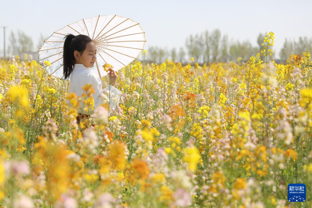 4月4日,小游客在河南省焦作市温县黄河街道下石井村油菜花田赏花拍照。