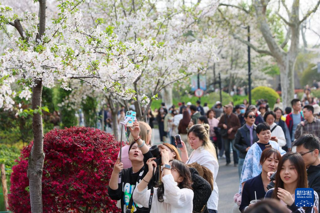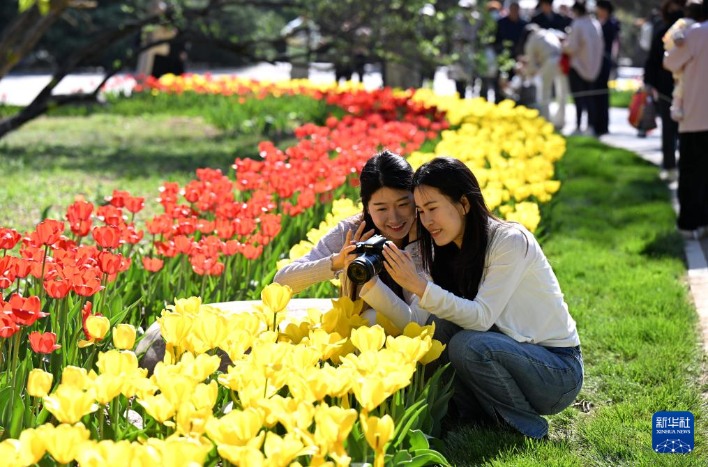 4月4日,游客在河北省石家庄市植物园赏花游玩。