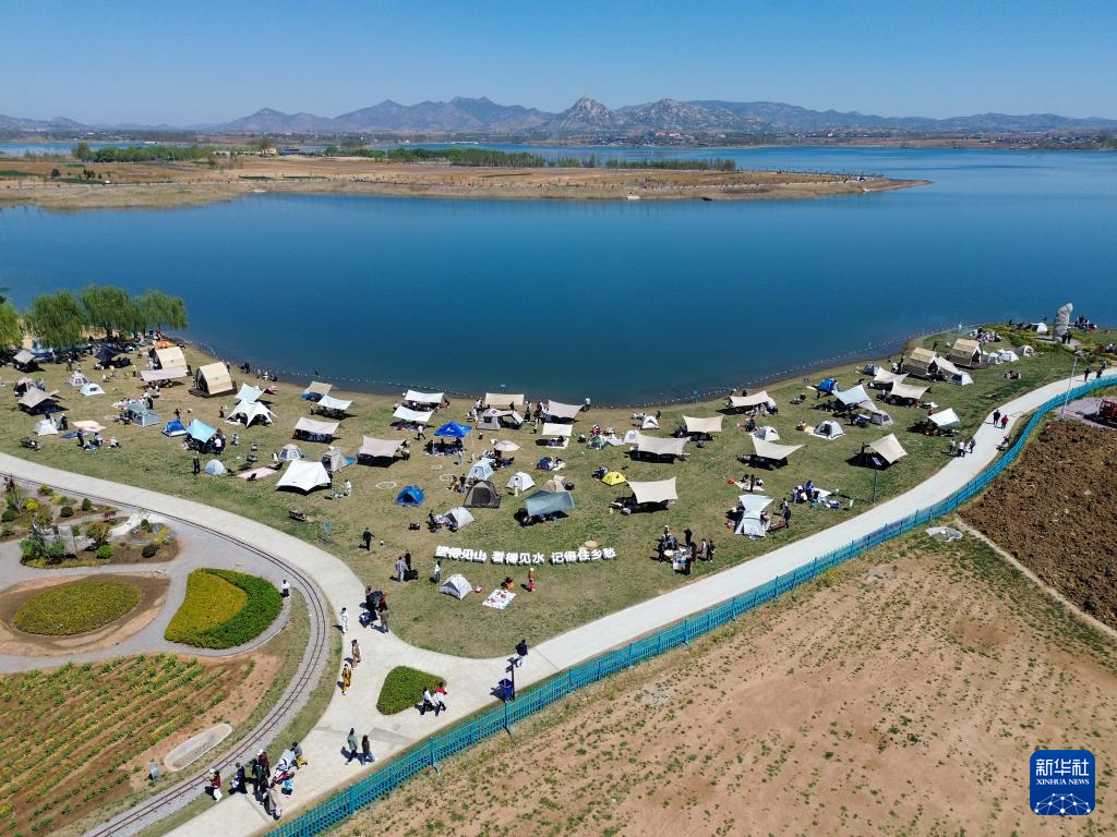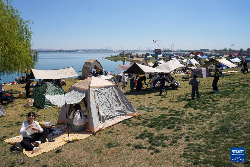 4月4日,游客在山东省滕州市龙阳镇“龙湖月色”省级乡村振兴齐鲁样板片区内露营休闲。