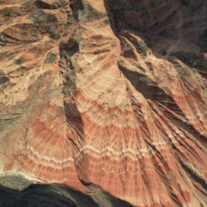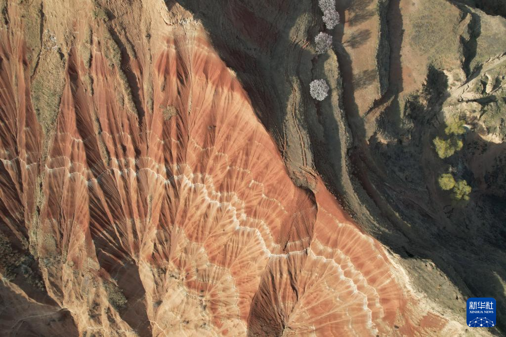 在甘肃省临夏回族自治州东乡族自治县东塬乡境内,有山岭岩层红褐与灰白相间,从高空俯瞰,形似一片片铺开的“羊肉卷”。