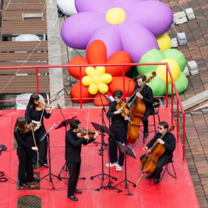 4月4日,俄罗斯莫斯科国立柴可夫斯基音乐学院独奏家室内乐团在百年弄堂屋顶演奏。