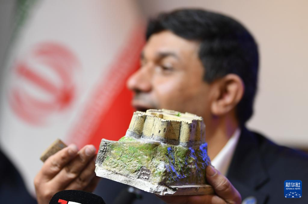 3月31日,在伊朗首都德黑兰,伊朗联合国教科文组织全国委员会秘书长哈桑·法尔图西手持法拉克·奥尔·阿夫拉克城堡的模型出席新闻发布会。法拉克·奥尔·阿夫拉克城堡近日在美国和以色列发动的袭击中受损。