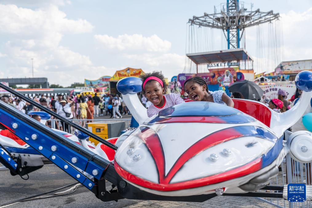 4月2日,游客在南非约翰内斯堡金山商展上乘坐游乐设施。