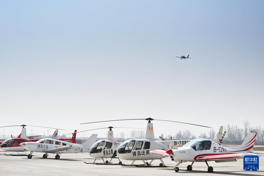 莱西店埠机场停机坪上停放着各型号飞机(4月2日摄)。
