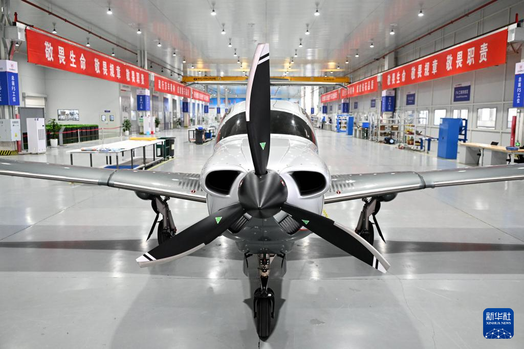 青岛万丰钻石飞机制造有限公司总装车间,一架完成安装调试的钻石DA50飞机准备下线交付(4月2日摄)。