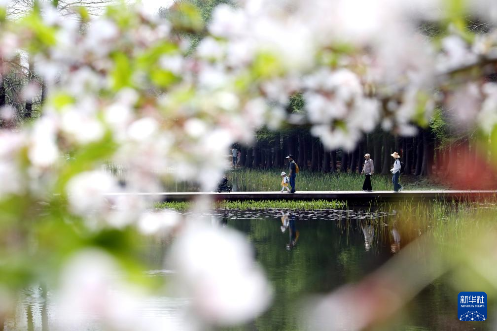 3月31日,游客在浙江省嘉兴市南湖区一处樱花园内赏花游玩。
