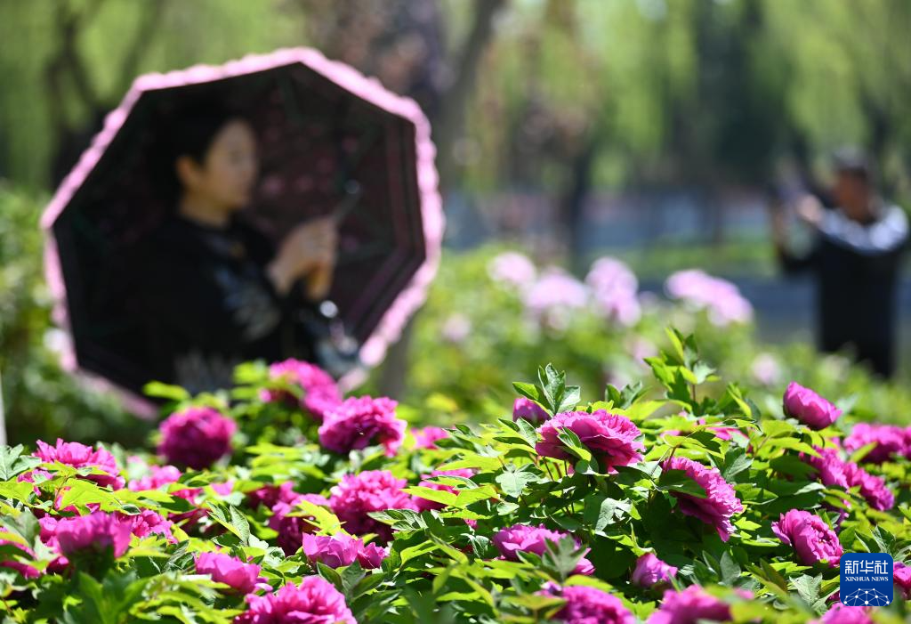 4月4日,游人在山东省滕州市荆河公园赏花游玩。