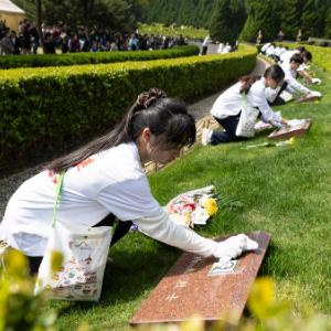 4月5日,学生在上海市龙华烈士陵园烈士墓区擦拭墓碑。
