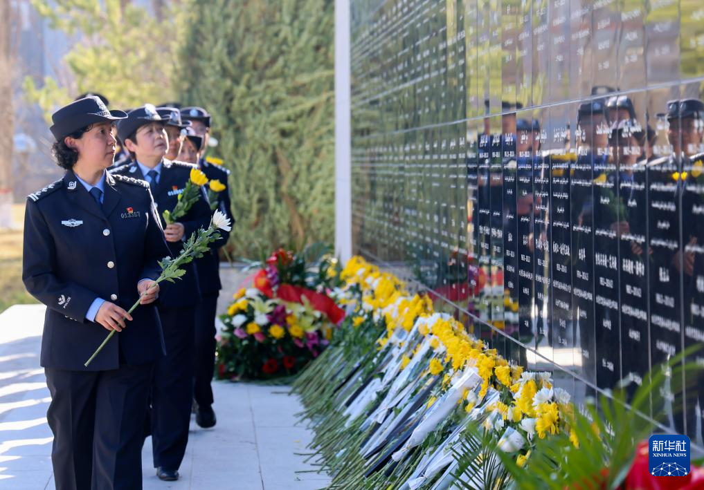 在乌鲁木齐市革命烈士陵园,民警在新疆公安英烈纪念碑前缅怀英烈(4月3日摄)。