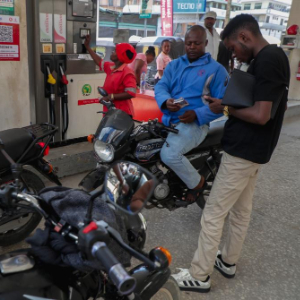 4月4日,摩托车主在坦桑尼亚达累斯萨拉姆一处加油站加油。