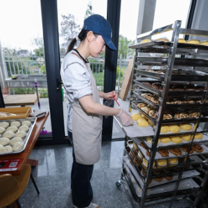 4月8日,在嘉兴市南湖区余新镇长秦村的“馒头酵主”创意馒头店内,店主沈峰(左)跟工作人员一起制作新中式馒头。该馒头店根据客户的订单制作不同风格口味的馒头,销售渠道以网上为主线下为辅,客户大多为年轻市民。