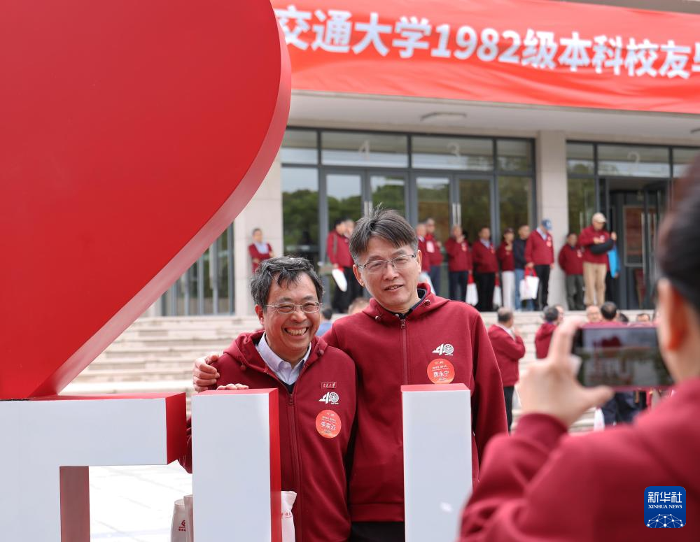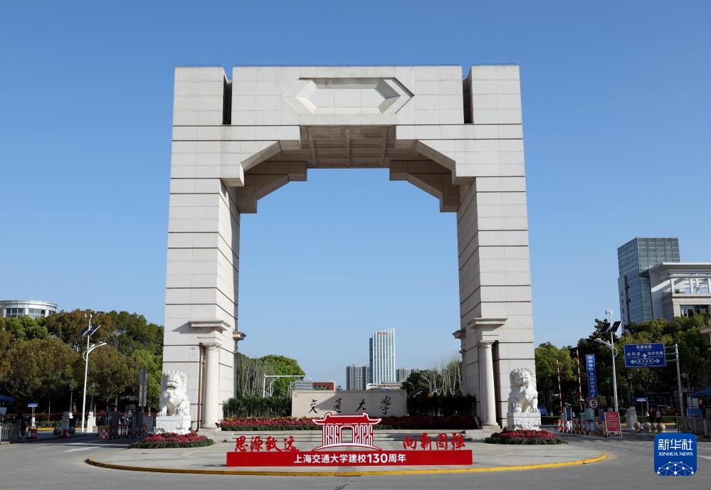 4月8日拍摄的上海交通大学校门前的建校130周年标志。
