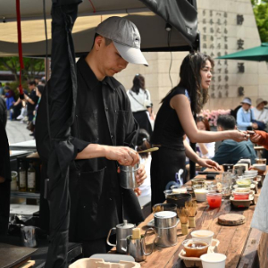 4月9日,在上海丰盛里·静安寺广场的咖啡文化市集上,咖啡师调制特色咖啡。