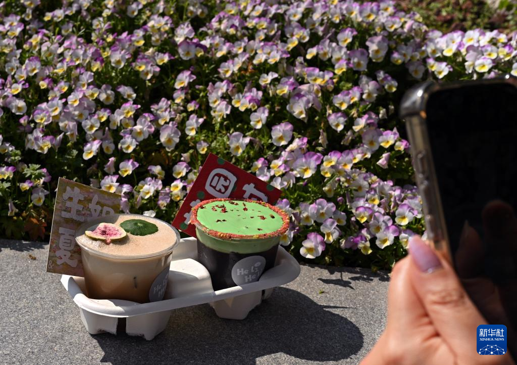 4月9日,在上海丰盛里·静安寺广场的咖啡文化市集上,一名顾客拍摄刚买到的特色咖啡。