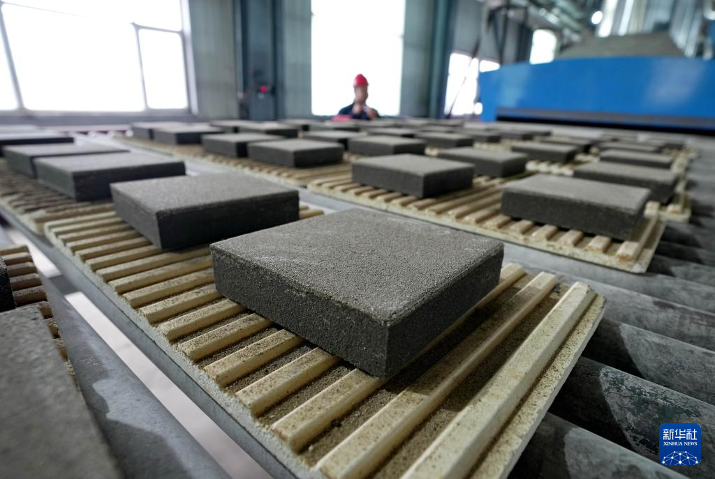 4月9日,工人在河北省迁安市一家以钢渣等固废为原料生产“钢砖”的企业生产车间工作。
