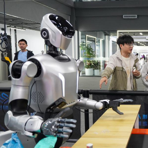 4月9日,学生在石景山人形机器人数据训练中心操控小型机器人。