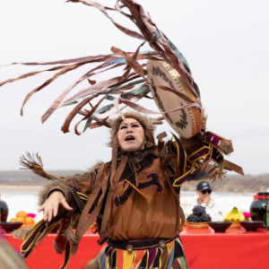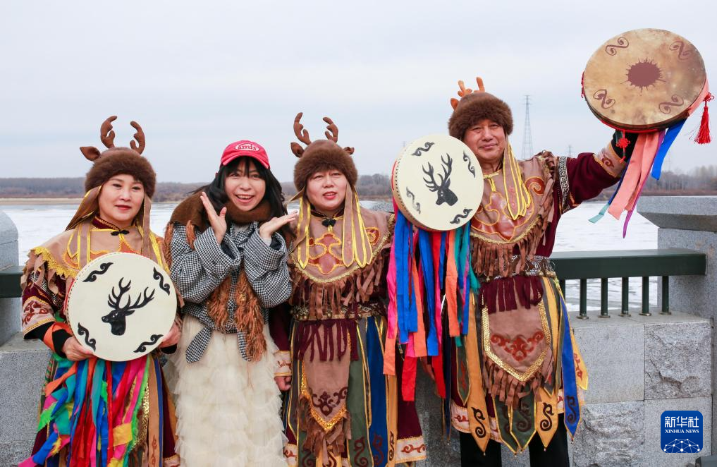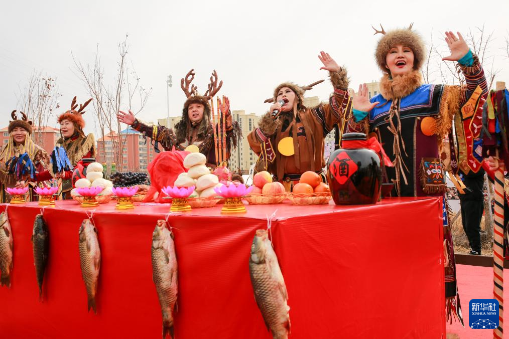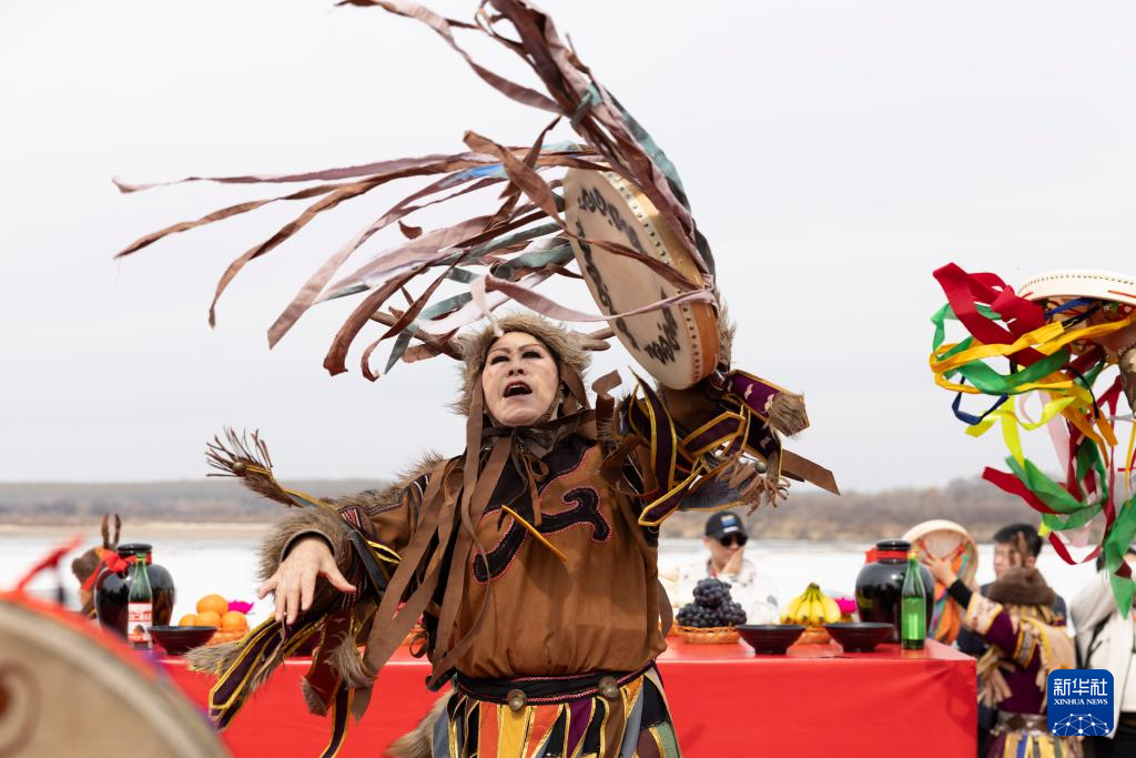 这是4月10日在2026“趣”佳木斯·喊江节现场拍摄的赫哲族开江祈福仪式。