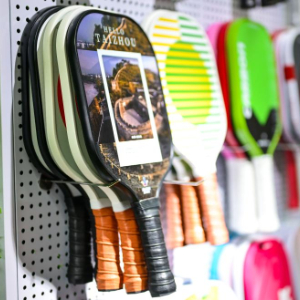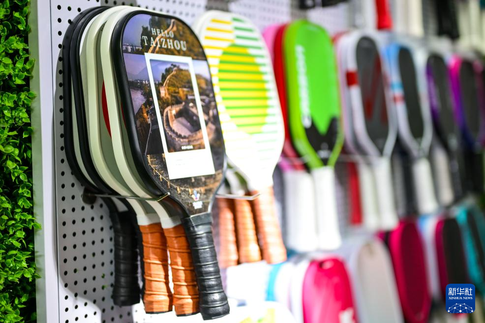 台州临海市一体育用品厂展厅内陈列的各类匹克球拍产品(4月10日摄)。