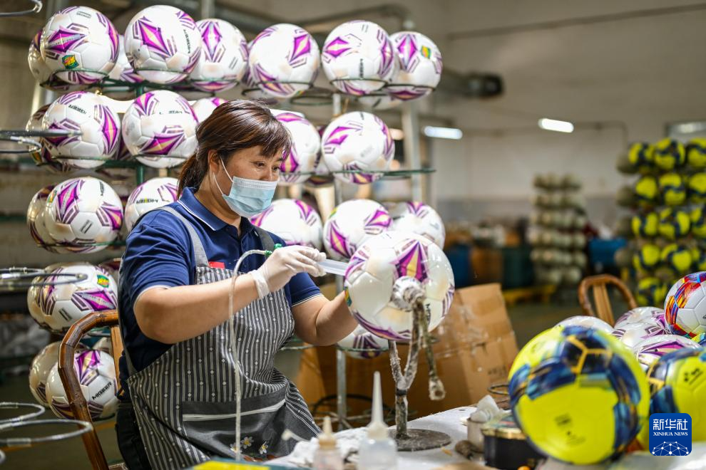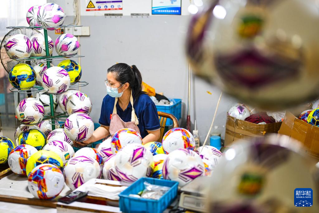 4月10日,员工在台州市一公司车间内生产足球。