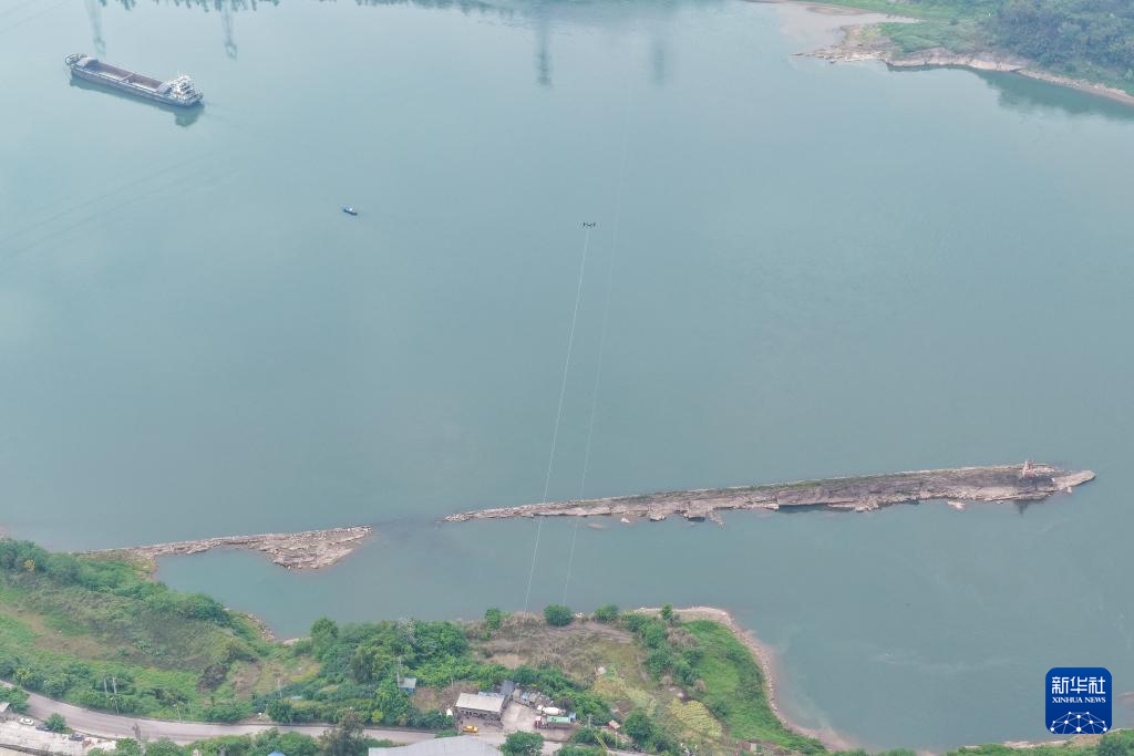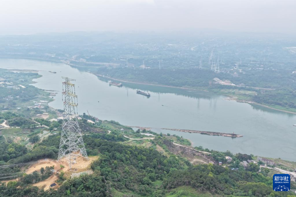 这是4月11日在重庆市江津区珞璜镇拍摄的新玉500千伏输变电工程(线路部分)跨长江放线作业现场(无人机照片)。