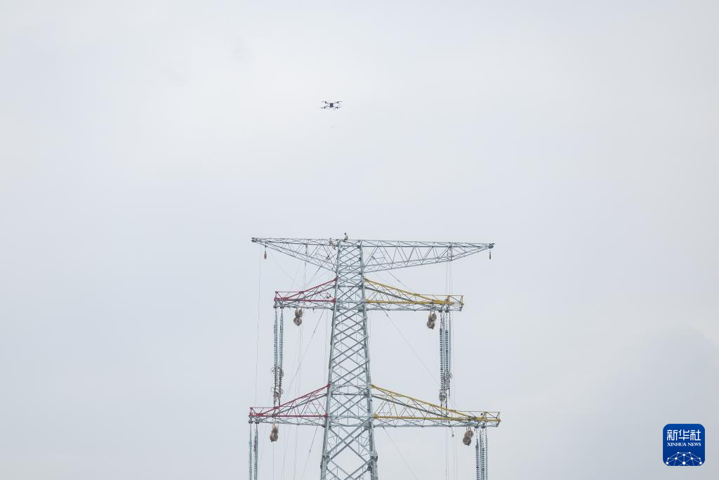 4月11日下午,在位于重庆市江津区珞璜镇的新玉500千伏输变电工程(线路部分)跨长江放线作业现场,国网重庆电力的工作人员使用大载重无人机搭载四段投掷器,牵拉导引绳顺利跨越长江。