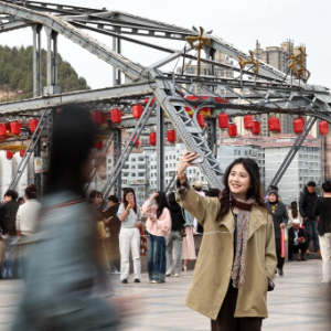 4月6日,游客在甘肃省兰州市中山铁桥拍照打卡。