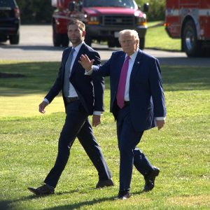 4月10日,美国总统特朗普(右)准备乘直升机离开华盛顿白宫。