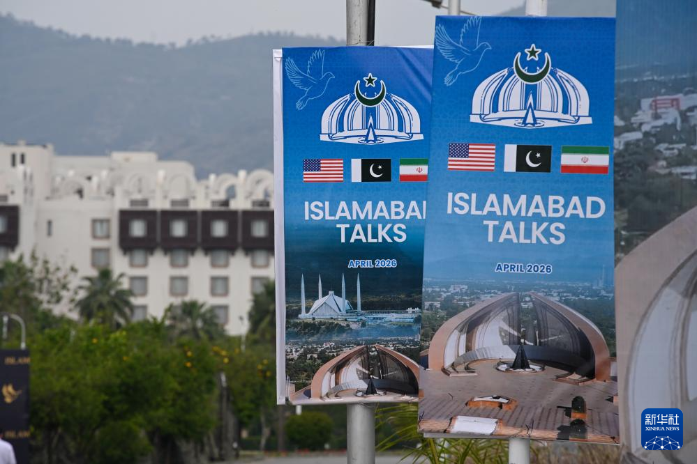 这是4月11日在巴基斯坦伊斯兰堡的美伊谈判新闻中心外拍摄的谈判相关海报。