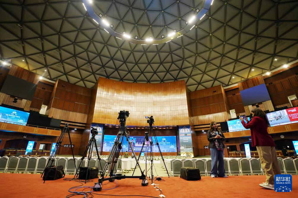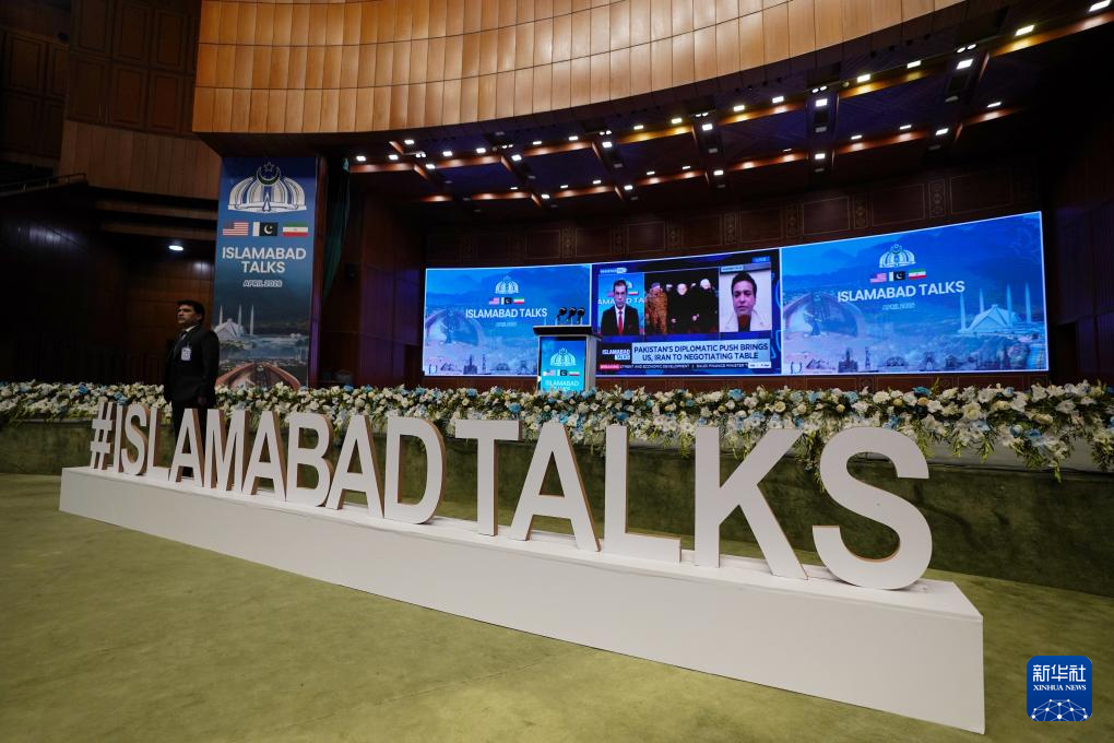 这是4月11日在巴基斯坦伊斯兰堡拍摄的美伊谈判新闻中心外景。