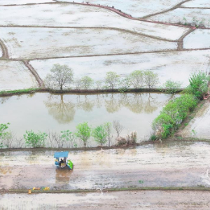 4月11日,在湖南省衡阳市祁东县金桥镇,农民驾驶插秧机进行早稻插秧工作(无人机照片)。