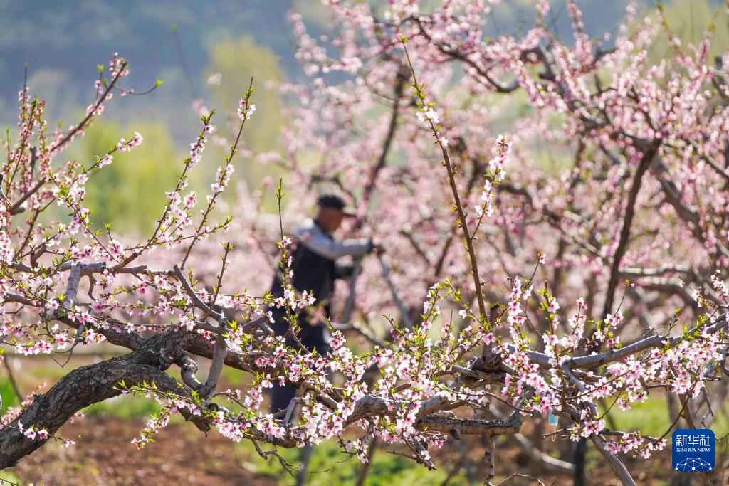 4月11日,北京市平谷区峪口镇农民在果园给桃树疏花。