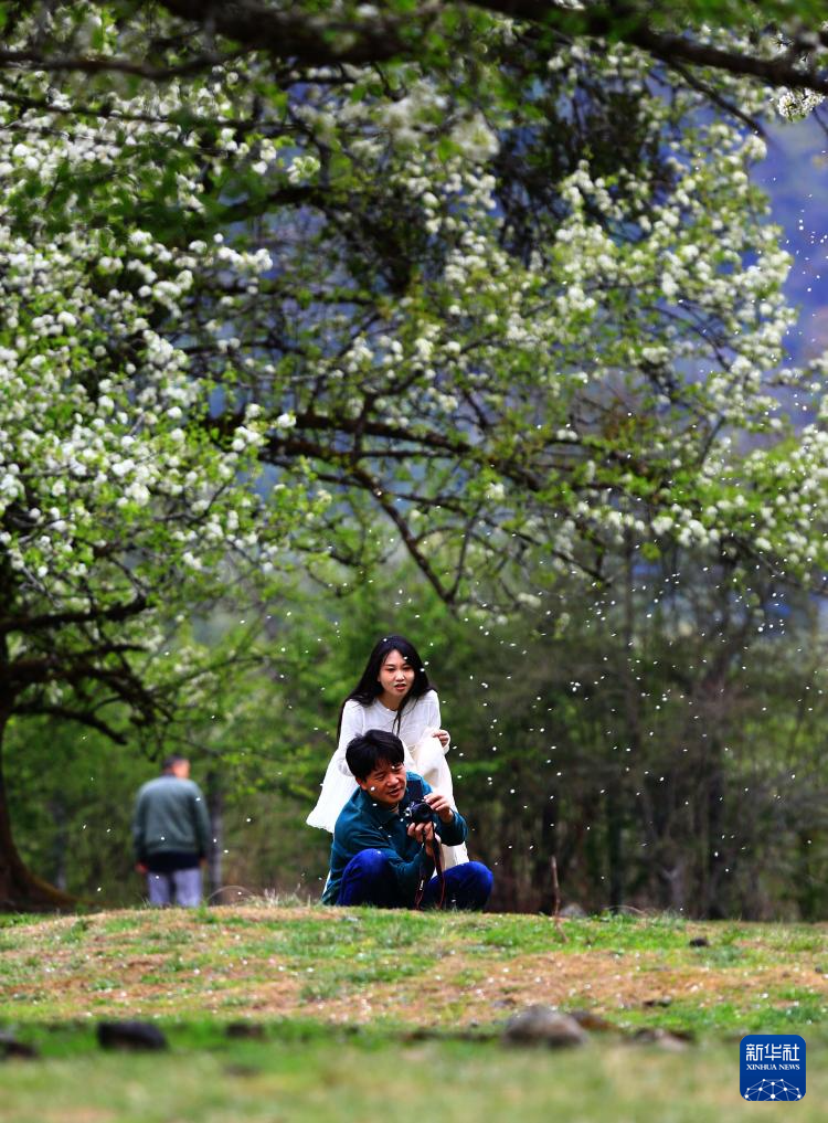 4月11日,游人在云南省腾冲市明光镇大竹坝棠梨花树下拍照。