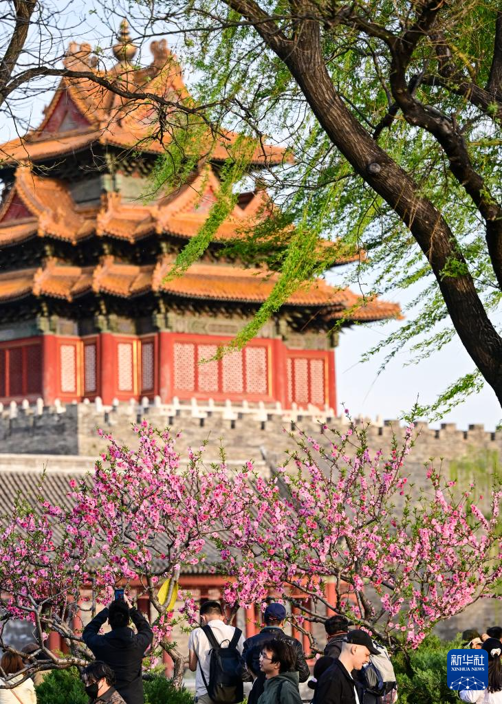 4月11日,游人在北京故宫西北角楼附近拍照。