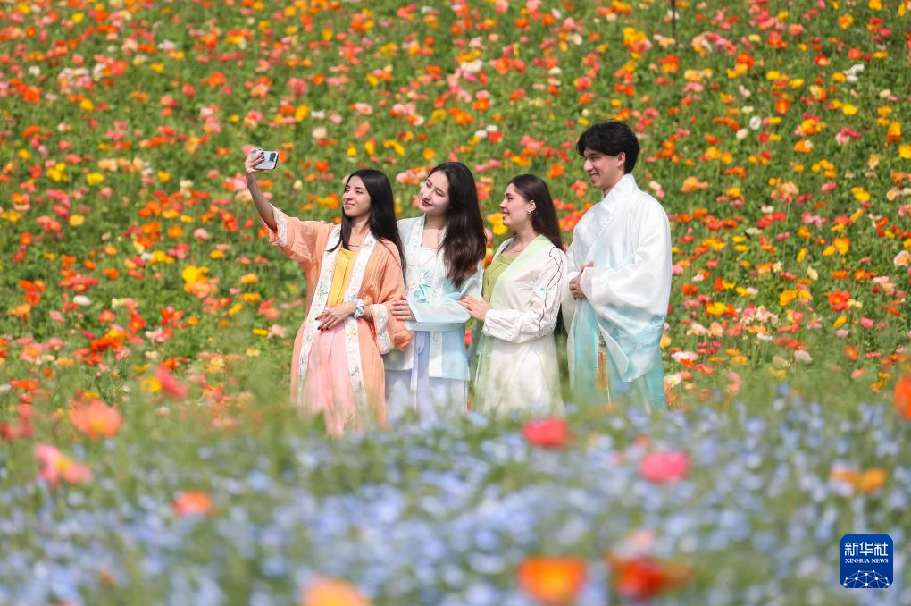 4月10日,在江苏省句容市白兔镇伏热花海,江苏农林职业技术学院的外国留学生在赏花拍照。