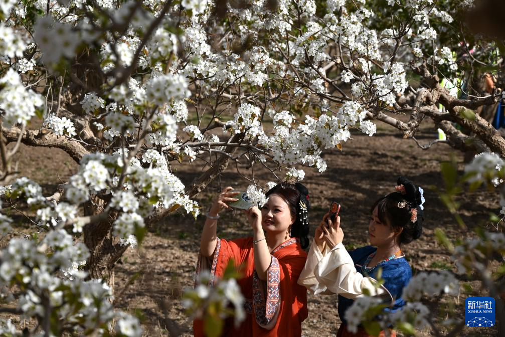 4月11日,人们在甘肃省敦煌市莫高镇莫高村的梨园中赏花拍照。