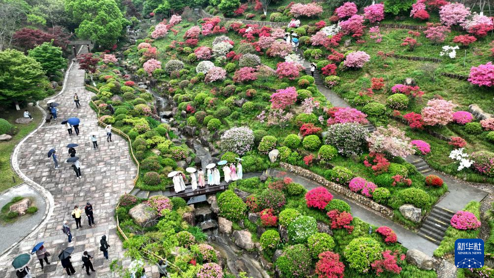 4月11日,游客在浙江省湖州市德清县下渚湖奇幻谷欣赏杜鹃花(无人机照片)。
