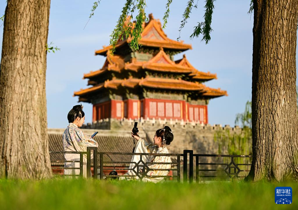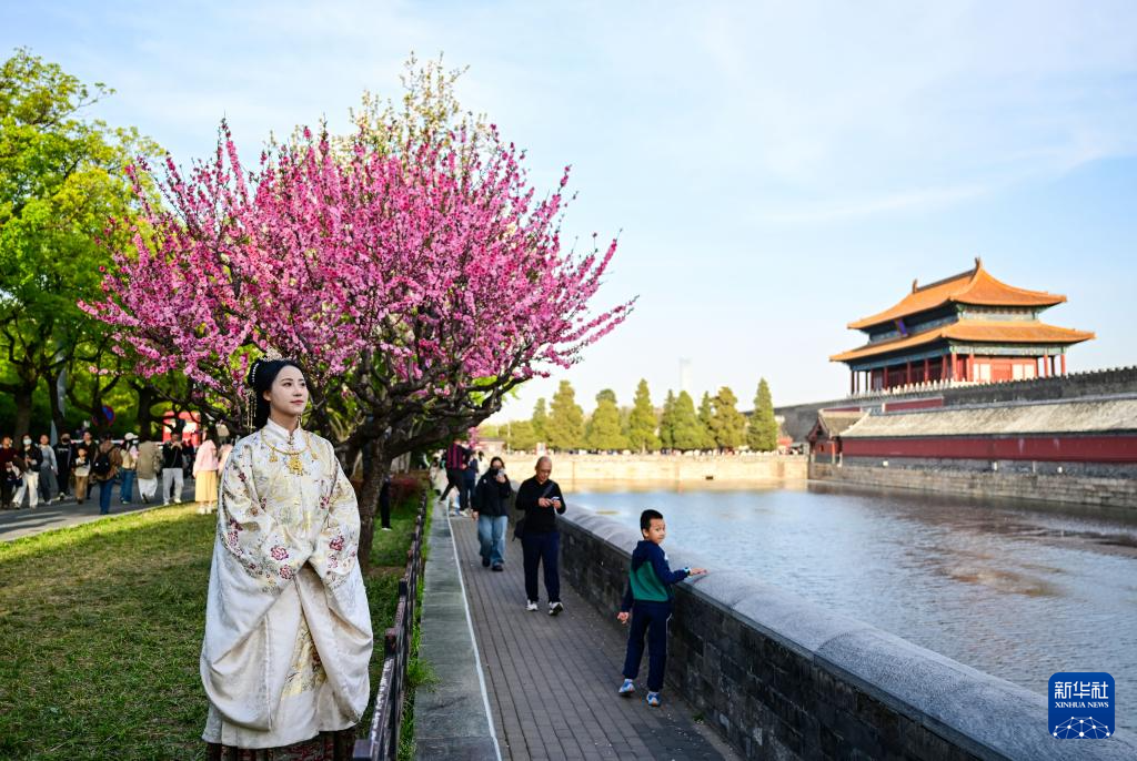4月11日,游人在北京故宫神武门附近拍照。